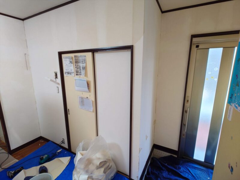 貼る面積は少ないので通常ですと糊を付けたクロスを持って来るのですが、A氏がこのクロスだと糊を付けてもって来ると折り目が目立つ可能性があると、機械を現場に用意して施工してくれました。さすが!!