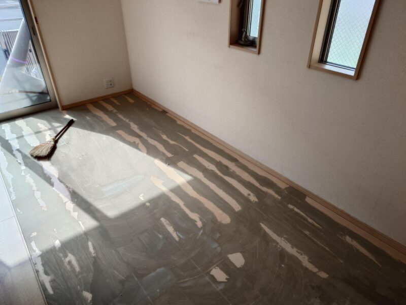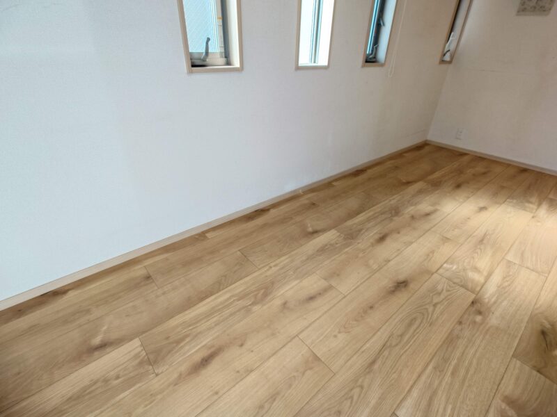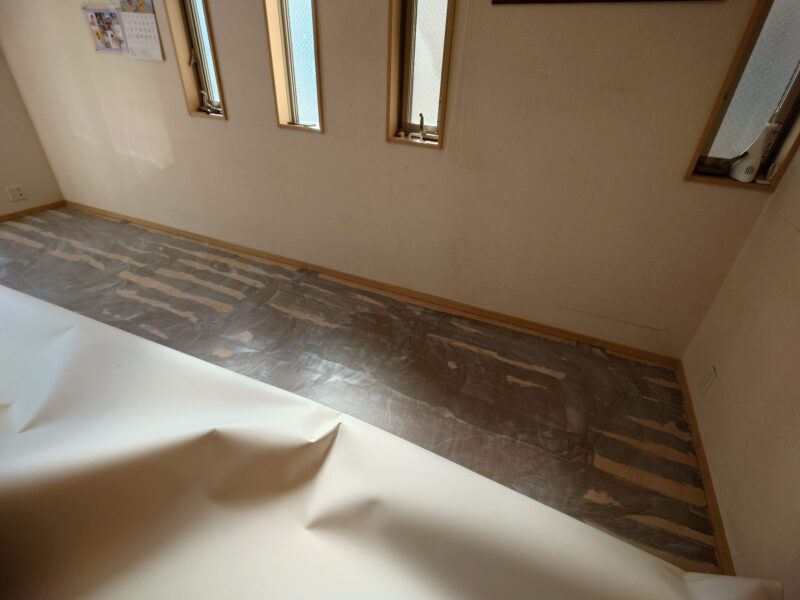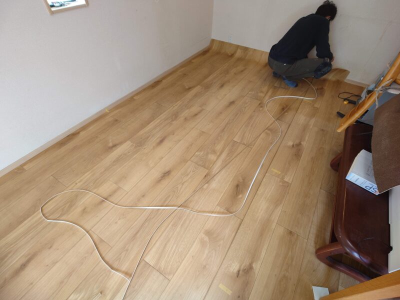 I様邸内装工事。木質フロアの上にサンゲツわんにゃん消臭フロアを上貼りしました。