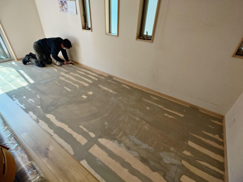 木質のフロアの目地を下地処理します。処理をせず上貼りをしますと特に横目地は目立ってしまいます。
